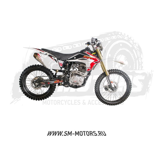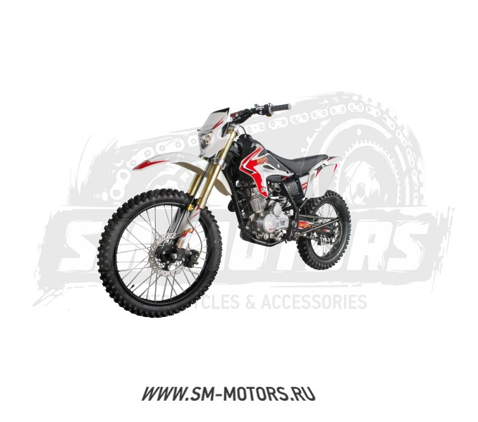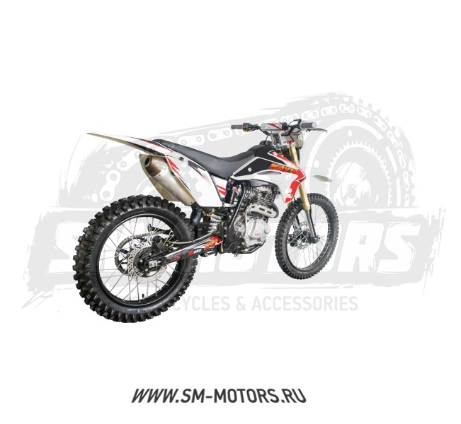 База,мм: 1350 Тип: "Кросс Сухая масса: 105 кг Рама: Пространственная, трубчатая, стальная Тип двигателя: Четырехтактный Рабочий объём: 233 куб.см. Коробка передач: 5-ти ступенчатая, механическая Система питания Карбюратор Максимальная мощность (л.с.): 16,4лс. при 7500об.мин. Высота по седлу,мм: 890 Система запуска: электростартер, кикстартер Система охлаждения: Воздушная Зажигание: Электронное Максимальная скорость: 110 (км/ч) Ёмкость топливного бака: 9,5 л Размер передней шины: 80/100-21 Размер задней шины: 110/90-18 Передний тормоз: Дисковый Задний тормоз: Дисковый Колёсные диски: Спицованные Привод: Цепь 428 Тип топлива: АИ-92(95) Передняя подвеска: Телескопическая перевёрнутая вилка Задняя подвеска Маятниковая, с моноамортизатором рюкзачного типа 420мм Комплектация: Внедорожные шины, дисковые тормоза, защита вилки, мощная фара